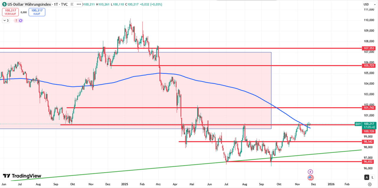Der DXY verharrt in einer sehr engen Range rund um die 100er Marke. Einem Bereich, an dem sich zusätzlich wichtige Widerstände bündeln. Hier wirkt der Markt wie ein Läufer, der auf das Startsignal wartet: ein entscheidender Impuls steht noch aus, der die nächste Richtung vorgibt.