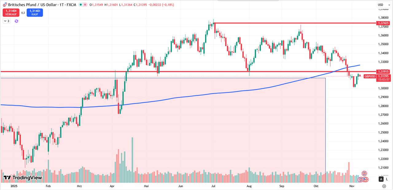 Liegt der Claimant Count Change bei mindestens –50K, kombiniert mit einer Arbeitslosenquote ab 4,8 % und Löhnen bei 5,0 % oder darunter, dürfte der Abwärtsweg sich fortsetzen. Ein Einstiegssetup am Widerstand bei 1,32 wäre dann interessant.