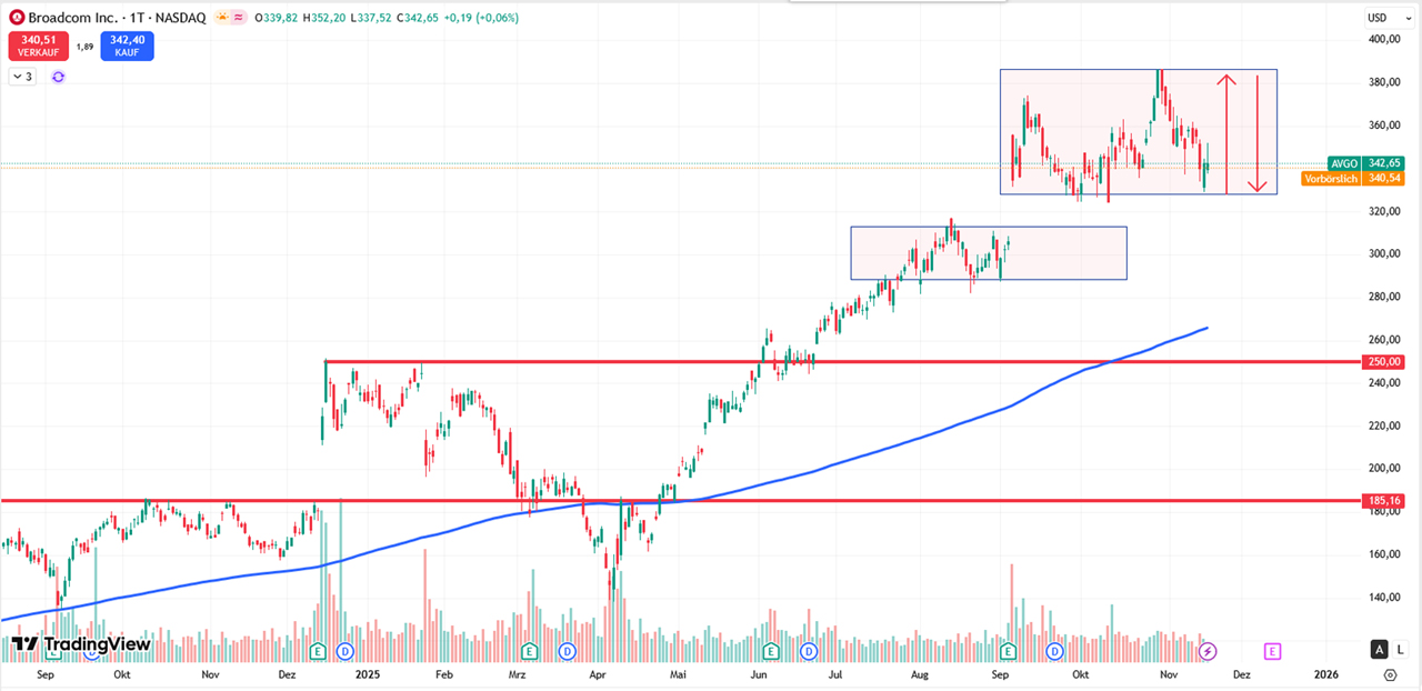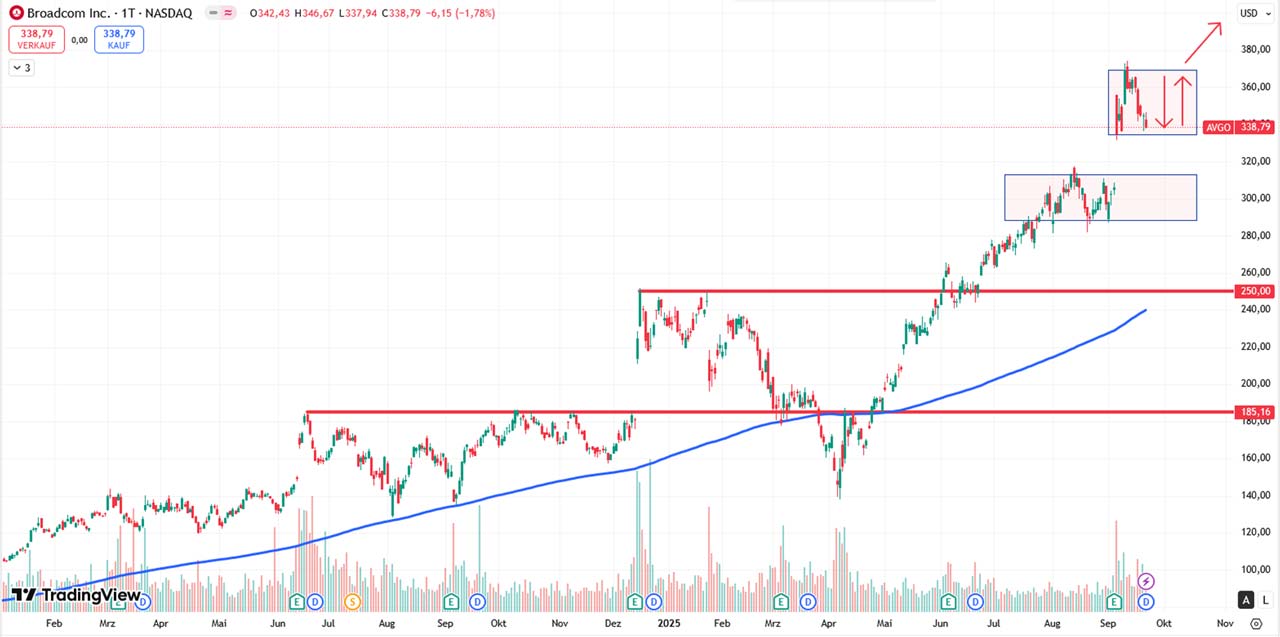 Broadcom gönnt sich nach der starken Rally die dringend notwendige Verschnaufpause und bewegt sich nun in einer sauberen Range zwischen etwa 335 und 370 USD.