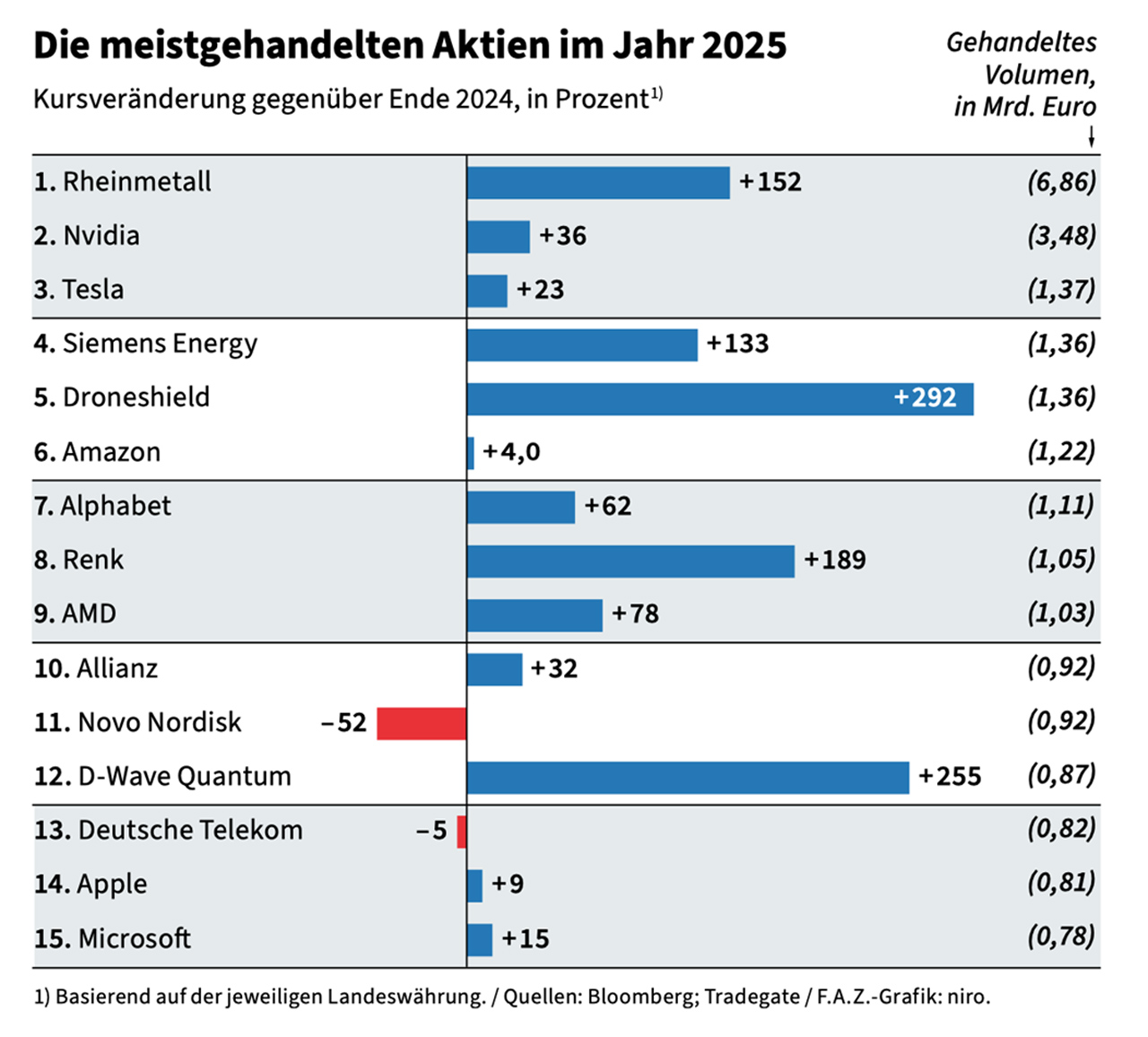 An den Aktienmärkten profitierten Technologieunternehmen vom anhaltenden Megatrend KI/Künstliche Intelligenz und konnten besonders in den USA (Stichwort Stargate-Initiative) ihre Dominanz auch in den Indizes weiter ausbauen. Angesichts der angespannten geopolitischen Lage zwischen EU und NATO-Partnern auch im Verhältnis zu Russland standen wenig überraschend auch Rüstungsaktien in der Gunst der Anleger ganz weit vorne, wie eine Auswertung der deutschen Wertpapierbörse Tradegate verdeutlicht (s. Grafik). Vor dem Hintergrund sich verändernder Kräfteverhältnisse in der internationalen Sicherheits- und Verteidigungspolitik, die sich besonders in der Nationalen Sicherheitsstrategie (NSA) der Trump-Administration ausdrückt, sicherlich kein kurzfristiger Trend (über den Ausfall Frankreichs und Deutschlands als ehemalige Vorreiter in Europa hingegen berichten wir leider auch beim Wirtschaftswachstum zu oft, es bleibt die Hoffnung auf Besserung).