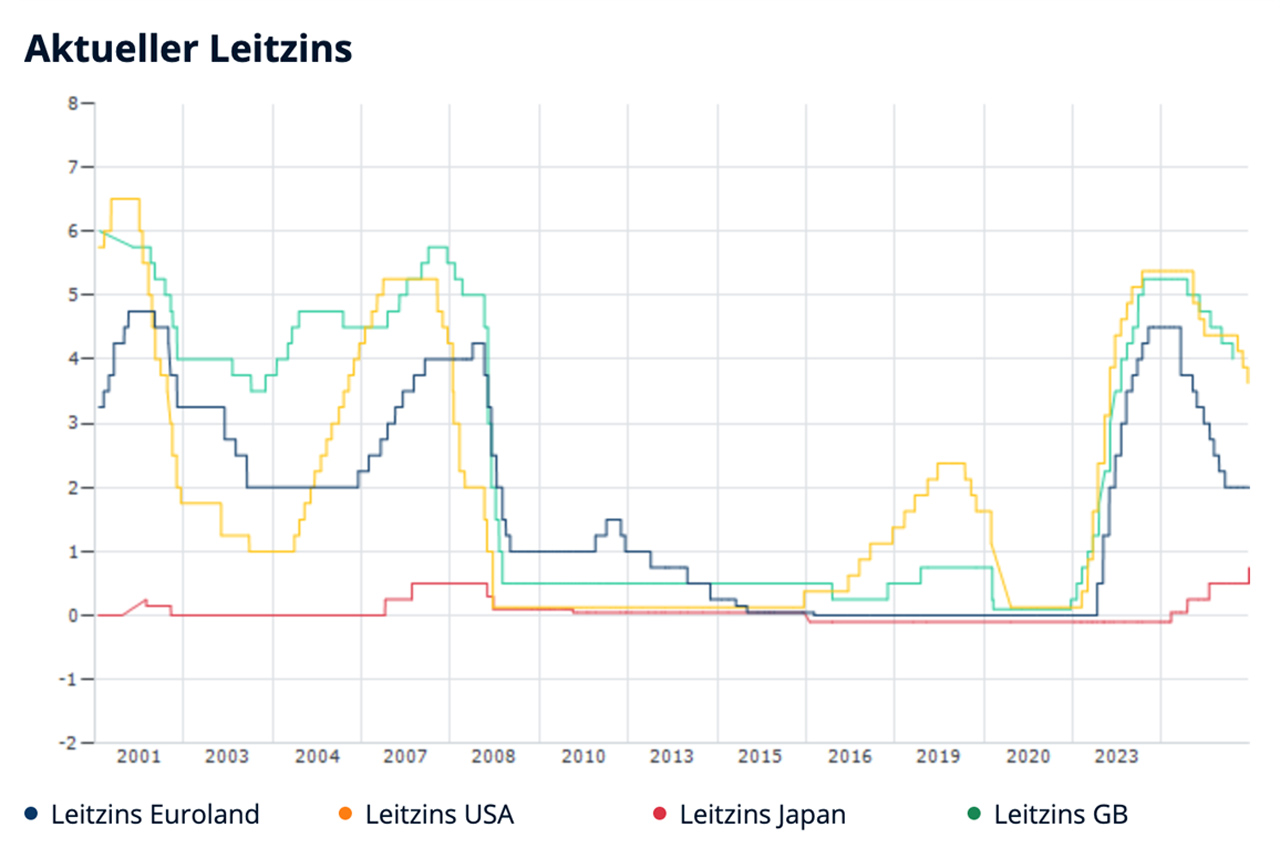 Unterstützt wurden die kreditintensiven Wachstumswerte von der Notenbankseite (mit Ausnahme von Japan – hier zeigt sich ein umgekehrtes Bild) durch das weltweite Zinssenkungsumfeld (s. Grafik). Seitens der US-Notenbank FED werden für 2026 weitere allerdings nachlassende Leitzinssenkungen prognostiziert.