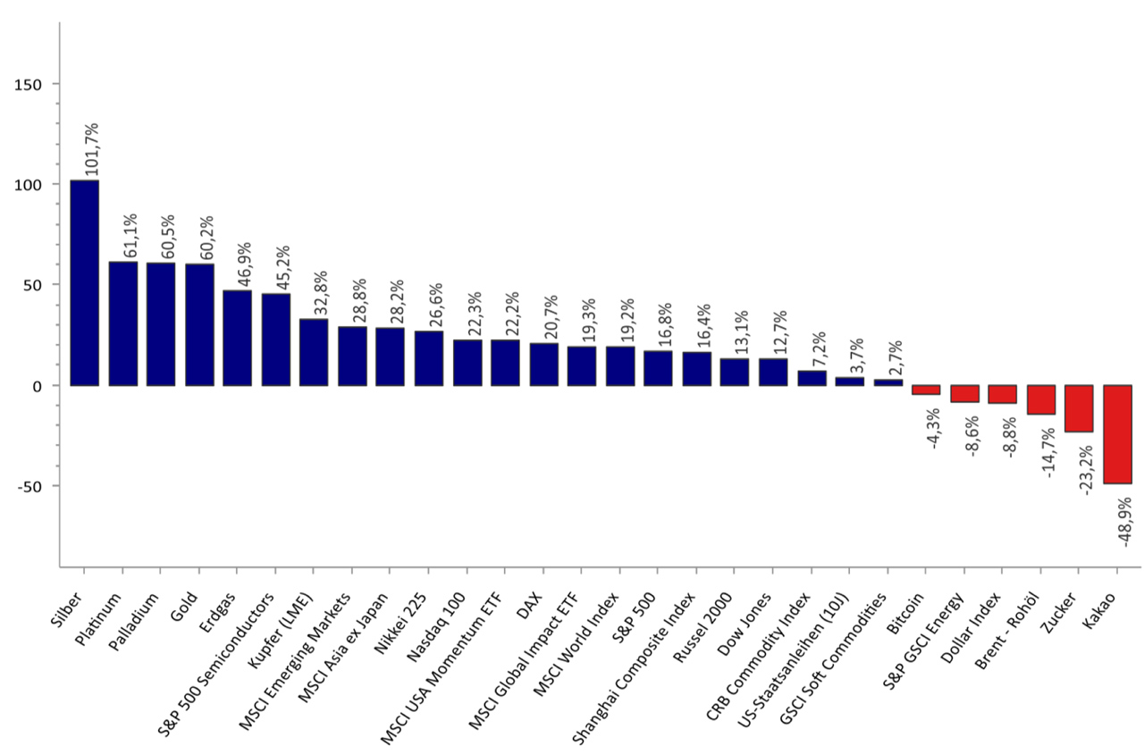 Zeit für einen kleinen Rückblick und Ausblick: Angesichts geopolitischer Verwerfungen (Ukraine, Gaza, Venezuela), international ausufernder Staatsverschuldungen und massiver Eingriffe seitens US-Präsident Donald Trump (sicherlich die bestimmende Figur dieses Börsenjahres) in Wirtschafts- und Notenbankpolitik führen Edelmetalle die weltweite Performance-Rangliste der weltweiten Anlageklassen (s. Grafik) an.