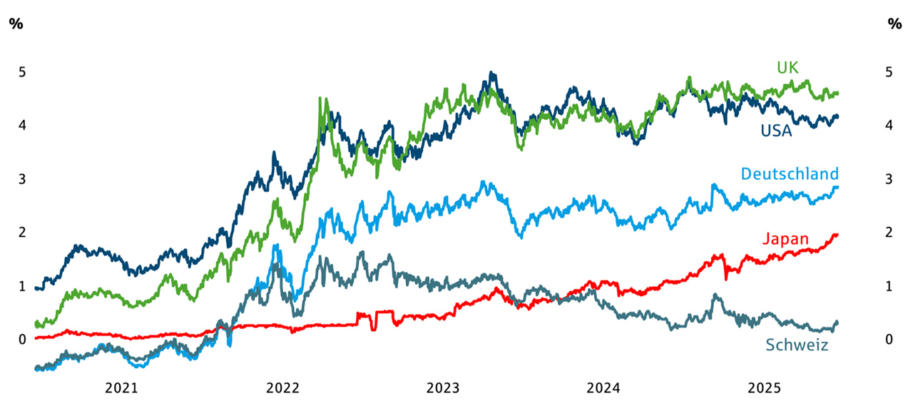 Internationale Großinvestoren und Zentralbanken zogen diese Anlageklasse (ein Markt, den Trump nicht so leicht manipulieren kann) sogar den üblicherweise präferierten US-Staatsanleihen vor. Durch die massiven Attacken Trumps gegen seinen eigenen Notenbankchef Jerome Powell ist am Anleihemarkt ein Vertrauensverlust entstanden, zusätzlich tun Reformstaus in den westlichen Sozial- und Rentensystemen und einhergehende wachsende Staatsverschuldungen ihr Übriges. Dies zeigt sich in den Renditeaufschlägen für Staatspapiere in westlichen Industrienationen, die teilweise deutlich über dem jeweiligen Leitzins liegen (s.Grafik).