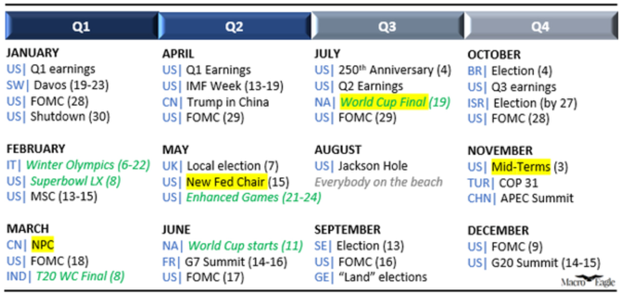 Im Mai endet dann die Amtszeit von FED-Chef Jerome Powell. Zusätzlich stehen im März mit dem Nationalkongress in China, im November mit den Mid-Term Elections in den USA und natürlich im Juli mit der Fußball-Weltmeisterschaft nicht nur für Börsianer wichtige Termine im Kalender für 2026 (s. Übersicht) an.