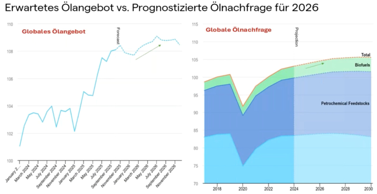Unterstützt wurde diese Entwicklung an den Währungsmärkten durch die ebenfalls von der Trump-Administration gewünscht herbeigeführte Abwertung des US-Dollar, wovon auch der Euro profitieren konnte. Im Gegensatz zu den Edelmetallen verbilligten sich an den Rohstoffmärkten nicht nur einige Agrarrohstoffe sondern im Energiebereich auch erneut der Rohölpreis, für 2026 prognostizieren die Energieagenturen hier ein weiteres Überangebot (s. Grafik).