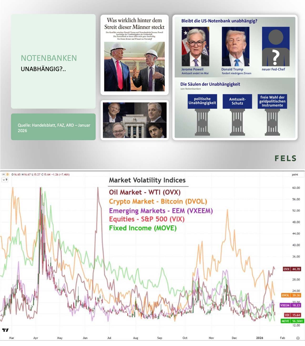 ähnlich wie das gesamte vergangene Börsenjahr (seht hierzu auch meinen Rückblick/Ausblick: https://followmymoney.de/finanzwissen/investment-research/insights/christian-schoeppe-jahreskommentar-2025-und-ausblick-2026/) hatte es der Börsenmonat Januar zum Jahresauftakt 2026 schon wieder richtig „in sich“ – und zwar für alle wichtigen Assetklassen die für erfolgreiche internationale Multi-Asset Anleger, die wir seit Jahren bei FELS begleiten, relevant sind: die Aktienmärkte konnten ihre Aufwärtstrends fortsetzen. Obwohl die nach wie vor bestimmende „Persönlichkeit“ der Geopolitik und Kapitalmärkte U.S. Präsident Donald Trump für eine zwischenzeitliche Unterbrechung durch erneute Zolldrohungen und sicherheitspolitische Ansprüche auf Grönland und Energierohstoffe sorgte, aber diese erneut in seinem Sinne auflösen konnte. Auch in die Notenbankpolitik mischt sich Trump angesichts des im Mai bevorstehenden Amtsendes von FED-Chef Jerome Powell gewohnt aktiv ein (s. Grafik). Die weltweiten Anleihemärkte spiegeln dies durch kontinuierlich ansteigende Risikoaufschläge erneut wider – und zwar angesichts des Dauerthemas genauso kontinuierlich ausufernder Staatsverschuldungen in der gesamten westlichen Hemisphäre von USA über Europa bis Japan und Australien (mit Ausnahme der Schweiz, unterstützt durch den Franken, der sich nicht nur zum Auftakt des neuen Börsenjahres erneut als „Fels in der Brandung“ an den internationalen Währungsmärkten zeigt). Dies hatte deutliche Volatilitätsausschläge an den internationalen Rohstoffmärkten zur Folge, angeführt von einem regelrechten „Hype“ bei den Edelmetallen zum Monatsende, wenig überraschend erfolgten ebenso massive Gewinnmitnahmen auch bei den Industriemetallen. Bei den Energierohstoffen deutete der Volatilitätsanstieg am Ölmarkt bereits zur Monatsmitte eine mögliche Trendwende beim Ölpreis an (Referenzsorte WTI) an (s. Grafik).