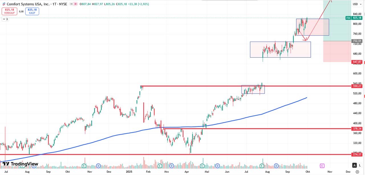 Comfort Systems hat geliefert. Die Aktie bestätigte die Serie steigender Tiefs und vollzog den entscheidenden Ausbruch nach oben und das unter erhöhtem Volumen. Genau dieses Zusammenspiel aus Stärke und Momentum war das technische Signal, auf das wir gewartet haben.
