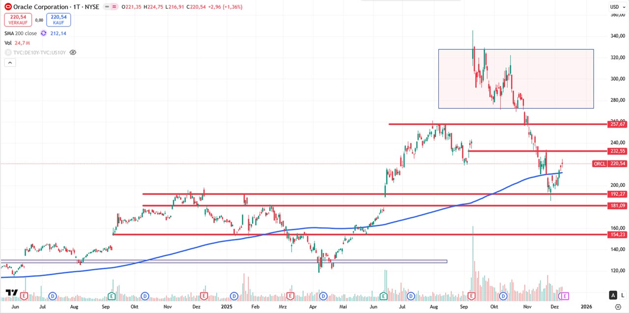 Deshalb wirkt die Aktie zuletzt wie jemand, der gleichzeitig rennen und schwere Gewichte tragen muss: Der Wille und das Potenzial sind riesig. aber die Last der Investitionen bremst jeden Sprint. Die steigenden Preise für Kreditausfallversicherungen auf Oracle verdeutlichen diese Angst.