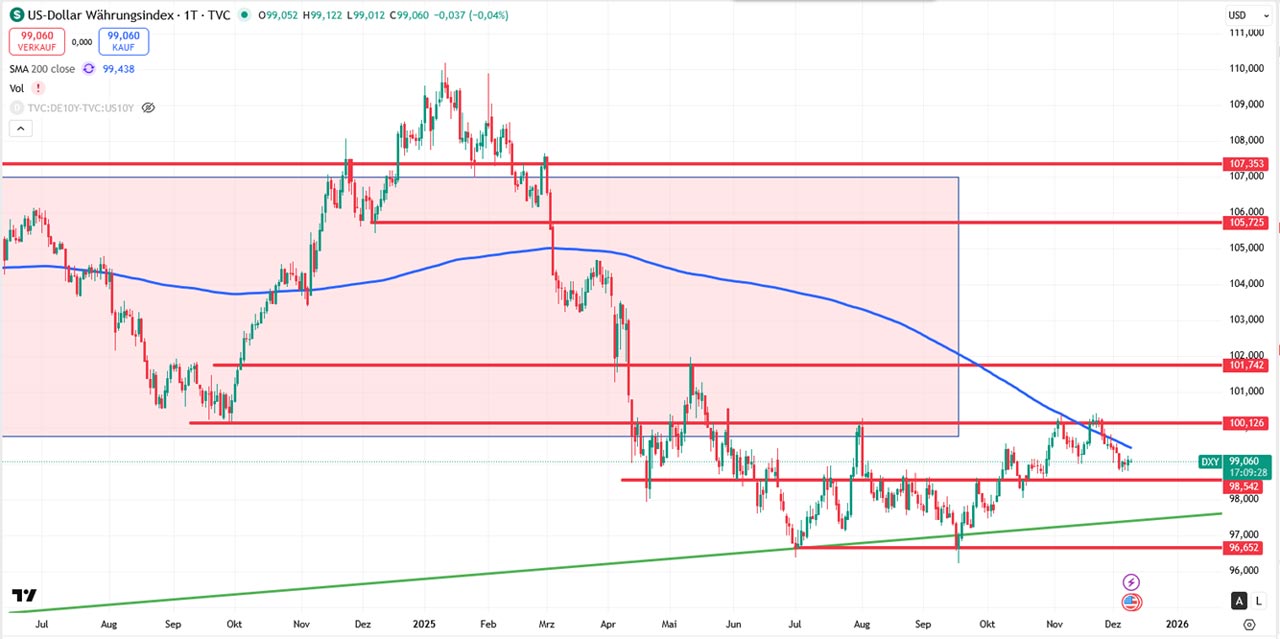 Bleibt 2026 ohne Zinssenkungen im Ausblick, könnte der Dollar Unterstützung finden. Dann wäre ein Long-Setup an der Unterstützung bei 98,50 interessant.
