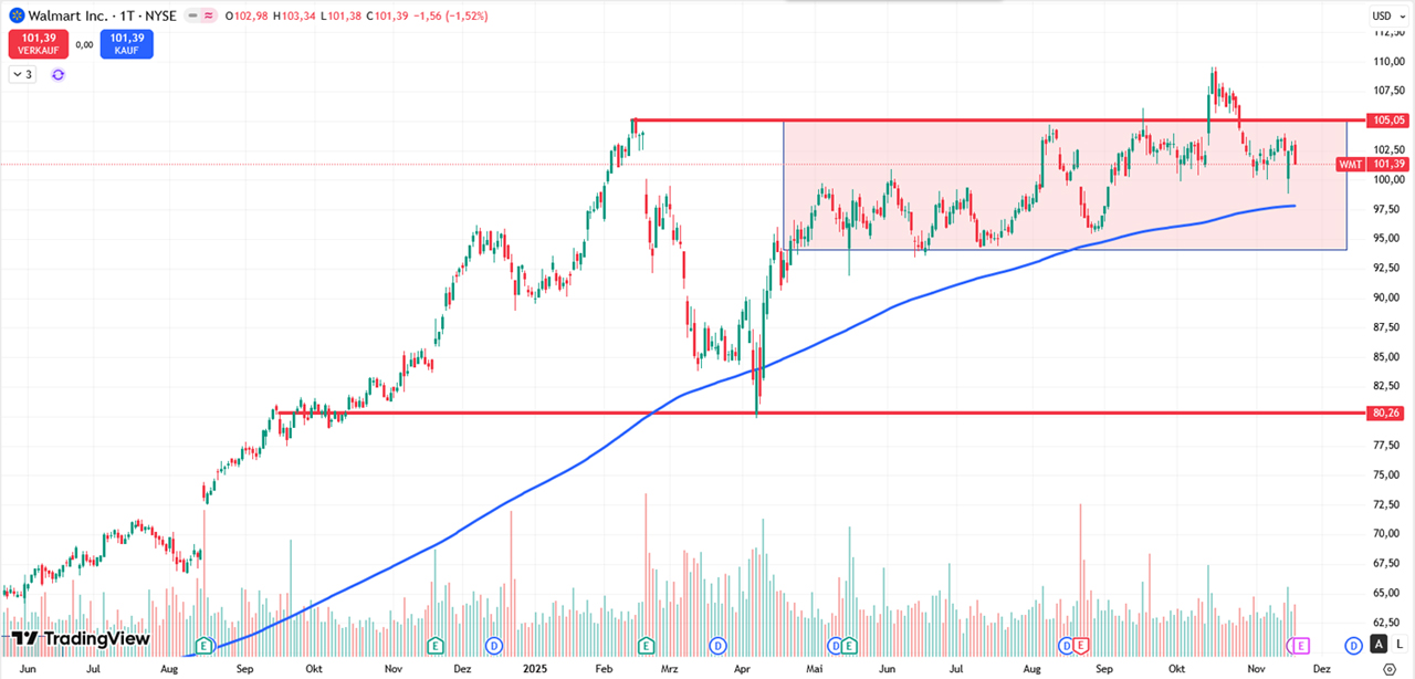 Seit Ende letzten Jahres bewegt sich die Aktie in einer großen Range zwischen 80 und 105 USD. Seit Mai notiert sie stabil im oberen Bereich dieser Zone. Ein positives Zeichen, auch wenn der Ausbruchsversuch im Oktober abgewiesen wurde. Die 200-Tage-Linie bildet die nächste wichtige Unterstützung, während 105 USD klarer Widerstand bleibt.