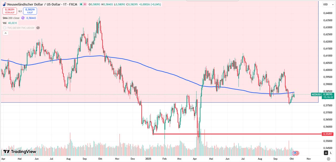 Der Kiwi notiert aktuell im leichten Abwärtstrend und genau an der 200-Tage-Linie, wie ein Drahtseilakt an einer entscheidenden Wegmarke. Die heutige Entscheidung könnte einen neuen Impuls bringen.