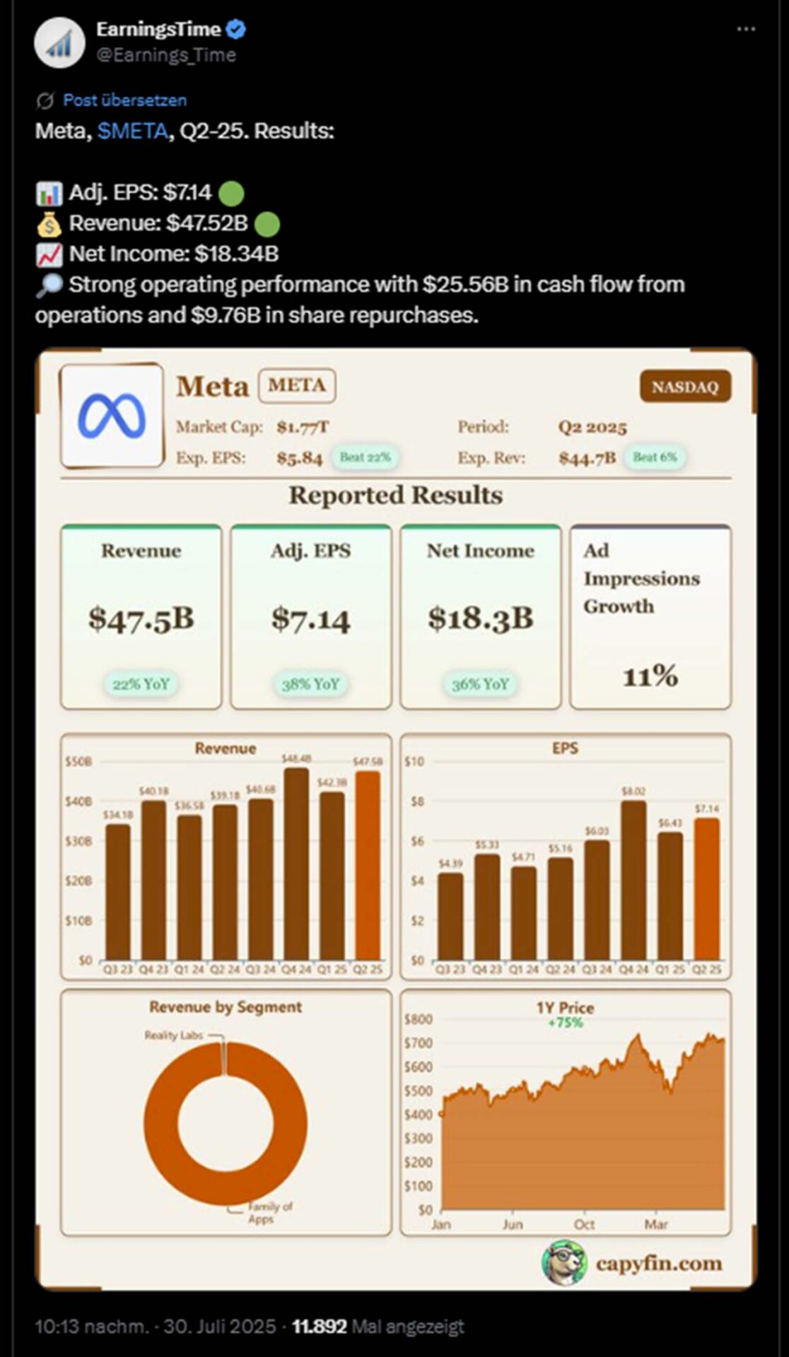 Wie zuvor Microsoft hat auch Meta mit seinen Quartalszahlen die Erwartungen der Analysten klar übertroffen und das bei anhaltend starkem Wachstum. Der Markt hat darauf mit einem kraftvollen Impuls reagiert. Für uns ist das eine eindrucksvolle Bestätigung der fundamentalen Story hinter der Aktie.
