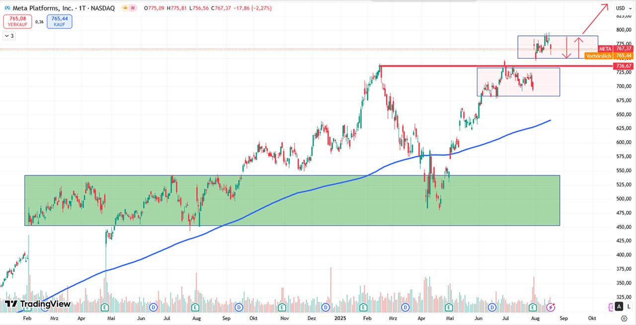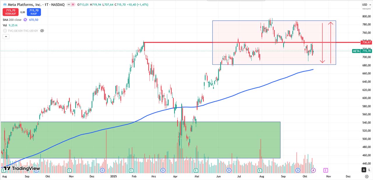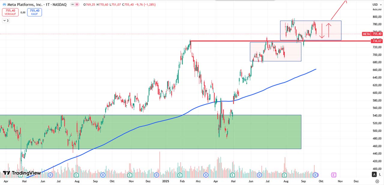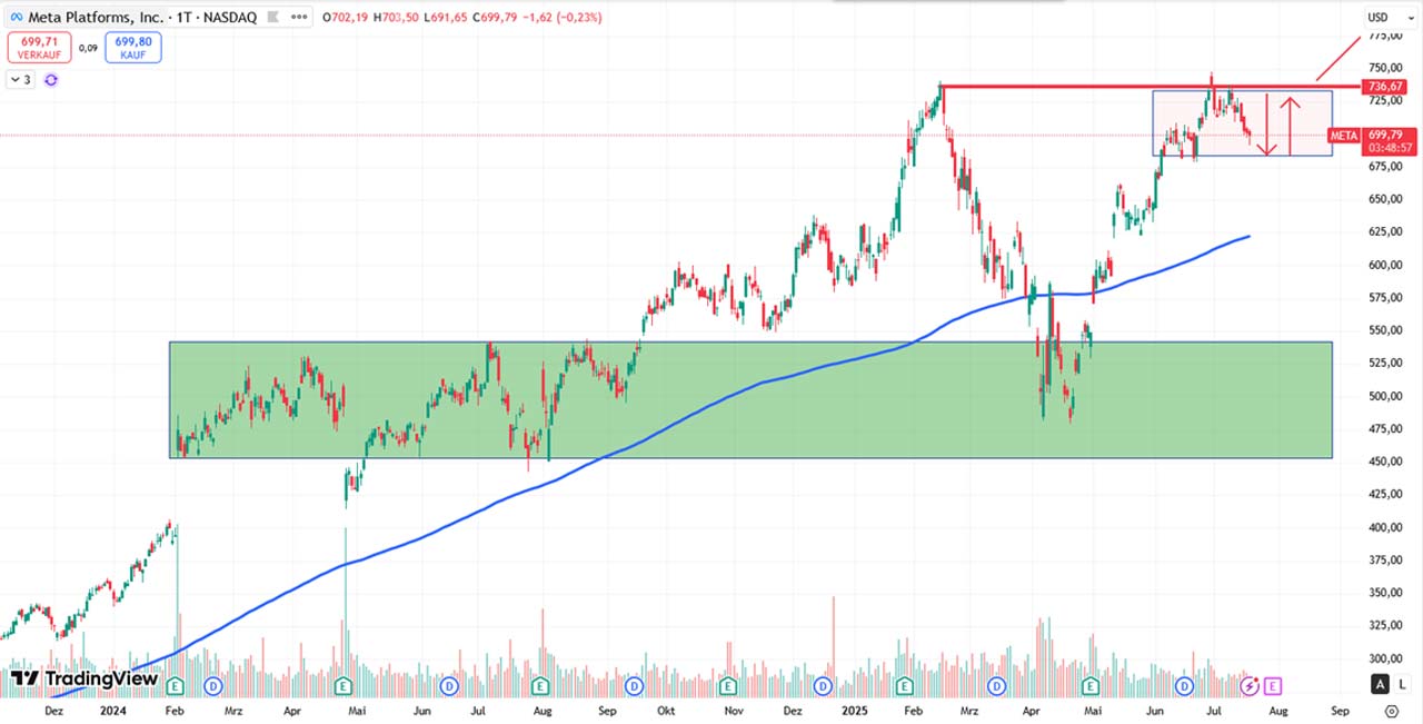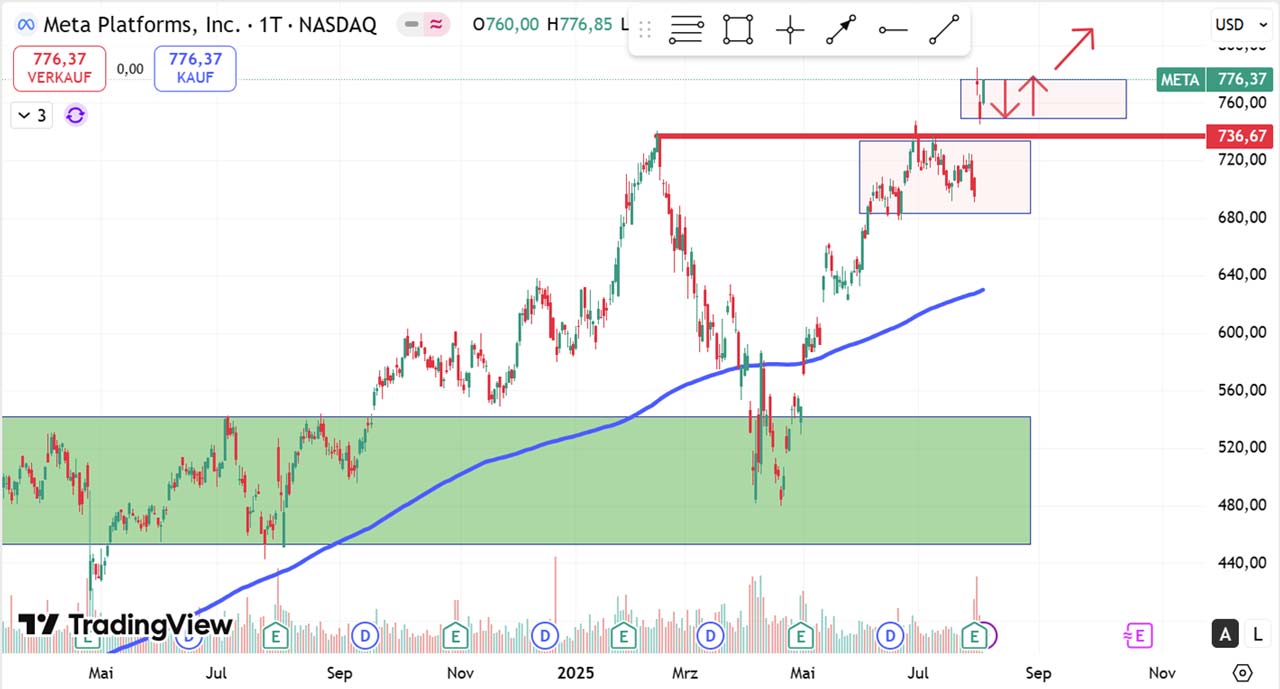 Die letzten Quartalszahlen haben der Aktie einen neuen Impuls verliehen, unterstützt durch ein allgemein starkes Marktumfeld. Vom Bereich um 500 USD konnte Meta dynamisch bis auf rund 740 USD zulegen.
