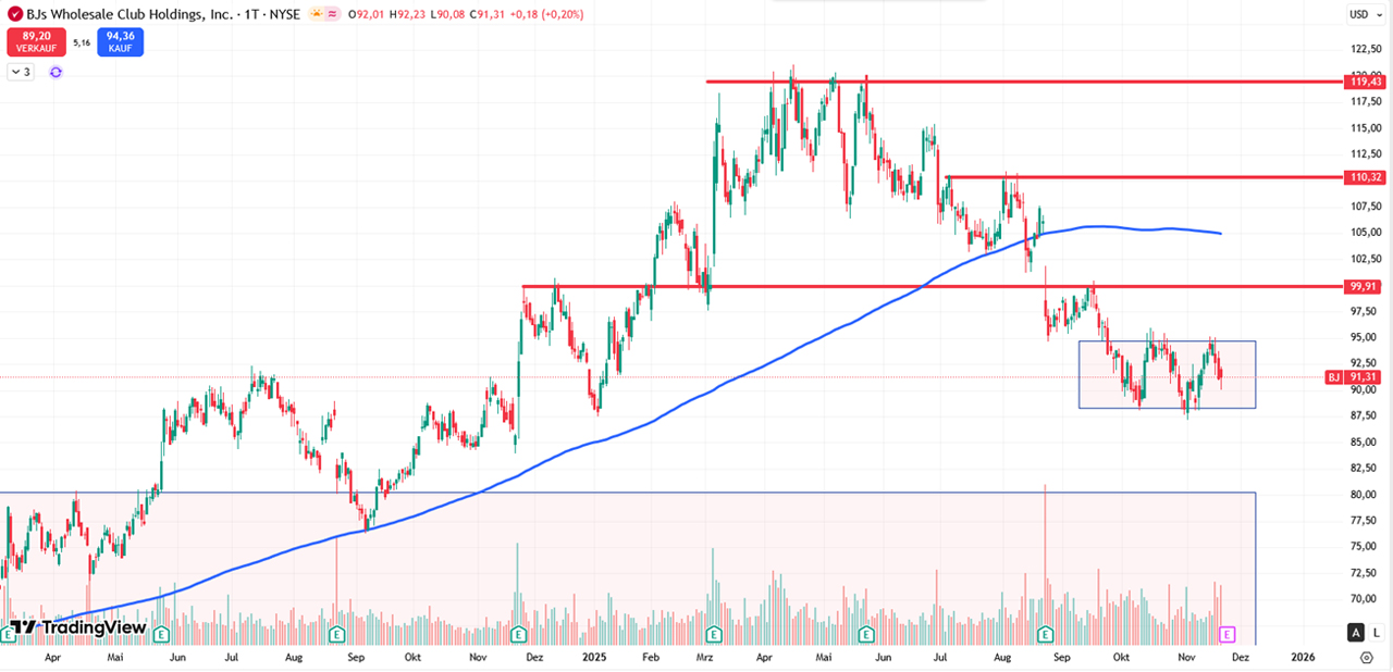 Die Aktie befindet sich seit dem Sommer in einem klaren Abwärtstrend und notiert unter der 200-Tage-Linie und ist damit technisch angeschlagen. Die aktuelle Konsolidierung zwischen 87,50 und 95 USD wirkt wie eine Atempause vor der nächsten Entscheidung.