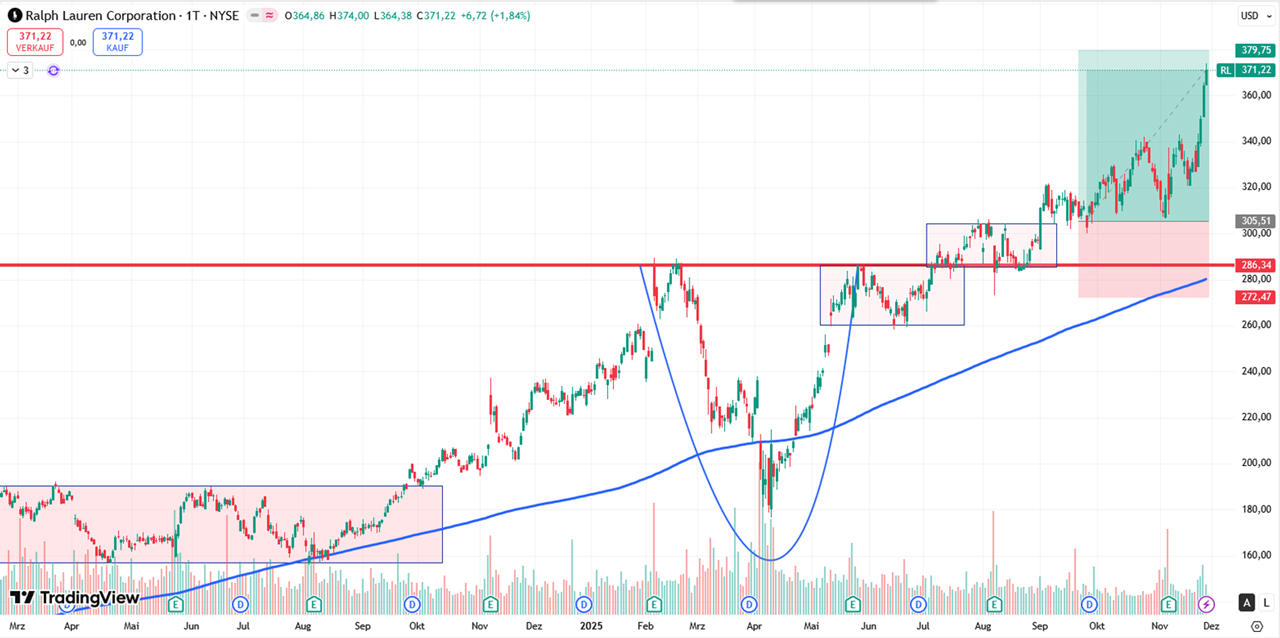 Ralph Lauren hat uns genau das geschenkt, was wir uns erhofft hatten: eine schnelle Thanksgiving-Rallye direkt nach dem Ausbruch, kraftvoll und zielgerichtet. Die erste Gewinnmitnahme war damit nur folgerichtig. Gleichzeitig bereiten wir uns mit dem neuen Limit bei 379,75 USD auf einen sich fortsetzenden Impuls vor.