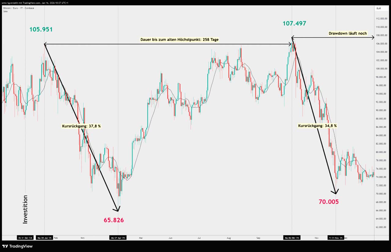Immerhin ein Drawdown von rund 38 %, der sich über mehr als 345 Kalendertage erstreckte. Die zweite große Verlustphase ist zum Jahresende noch nicht überwunden. Die Grafik zeigt: Auf Erholungen folgten Rückschläge oft schneller, als viele Anleger erwartet hatten.
