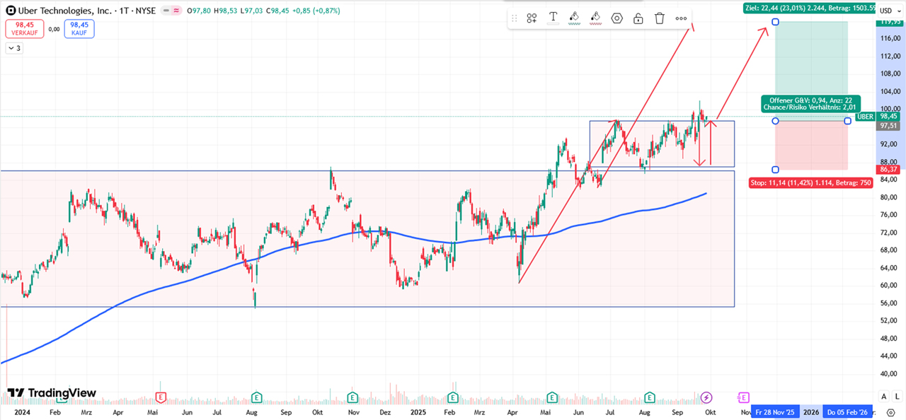 Unsere fundamentale Idee hinter Uber bleibt unverändert stark: Das Unternehmen profitiert weiterhin von seiner globalen Plattform, der wachsenden Profitabilität und den langfristigen Chancen im Mobilitäts- und Liefergeschäft. Nun liefert uns auch das Chartbild das klare technische Kaufsignal, auf das wir gewartet haben.