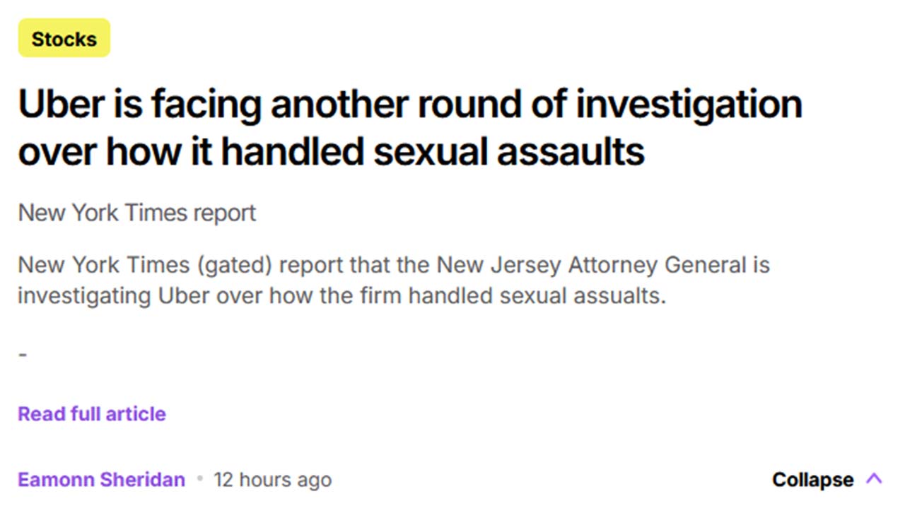 Uber hat die kurze Schwächephase nach der positiven Meldung der Konkurrenz erstaunlich schnell abgeschüttelt und mit Stärke geantwortet. Genau das wollen wir in einem Unternehmen sehen: Widerstandskraft, wenn andere glauben, er könnte ins Straucheln geraten.