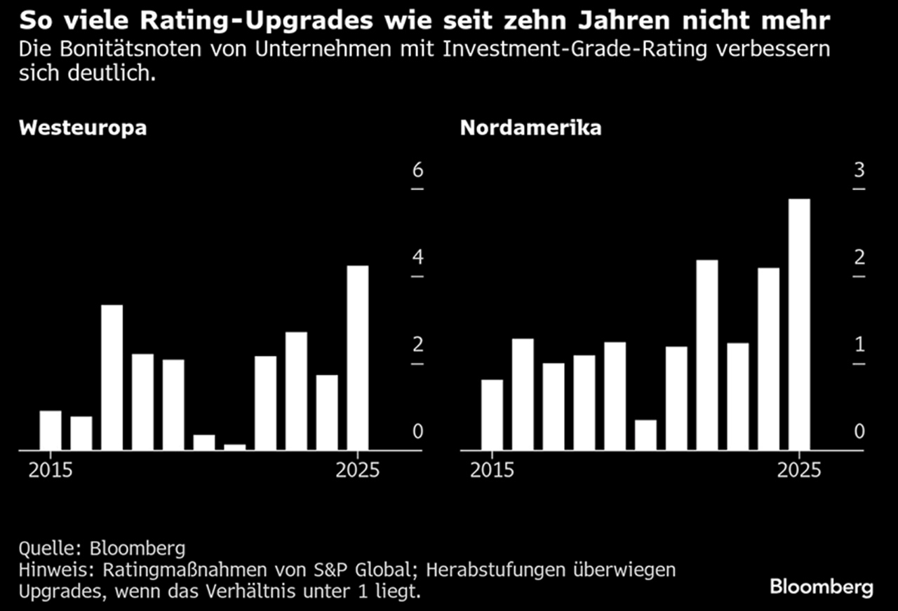 Das zeigt sich auch in den Bonitätsbewertungen: Sowohl die USA als auch Frankreich wurden zuletzt herabgestuft, während Unternehmen in Nordamerika und Westeuropa so viele Hochstufungen erhielten wie seit einem Jahrzehnt nicht