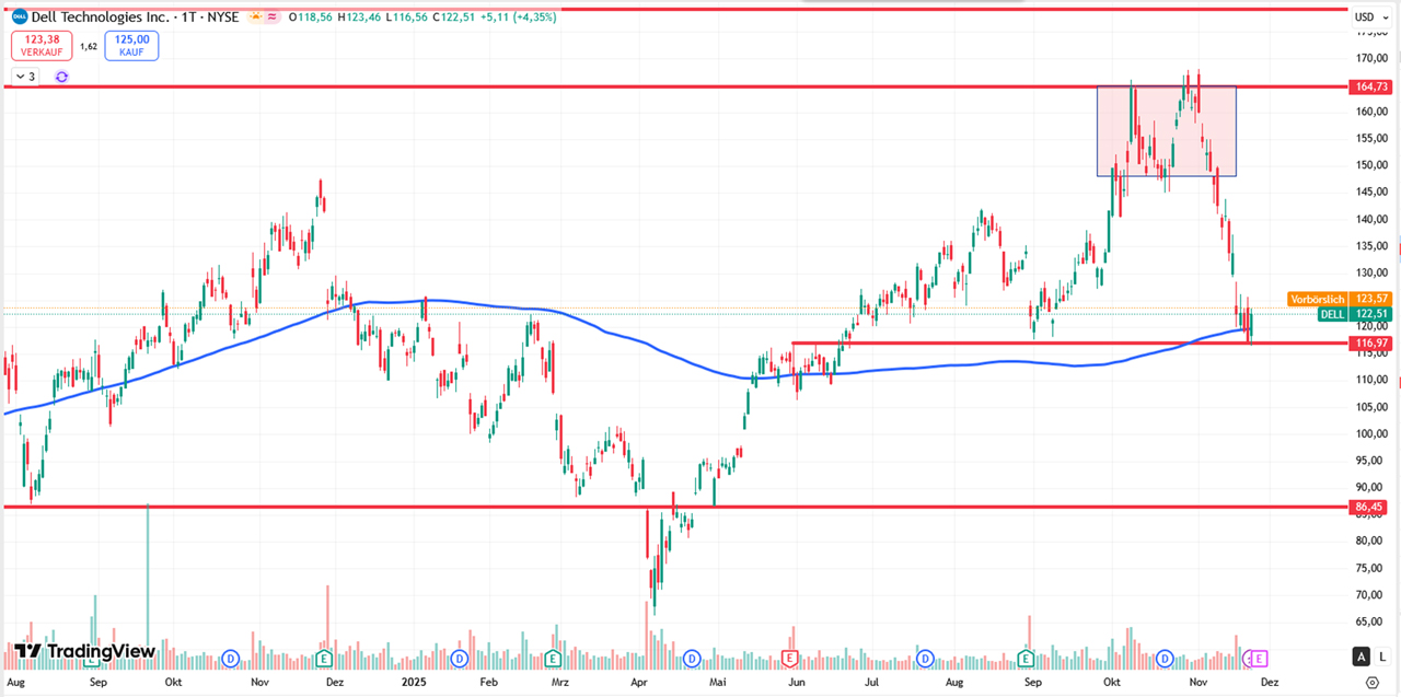 Dell bewegt sich weiterhin in der großen Range zwischen 86 und 165 USD, die bereits seit 2024 Bestand hat. Aktuell testet die Aktie die 200-Tage-Linie, wo sich entscheidet, ob der kurzfristige Abwärtstrend weiter Bestand hat.