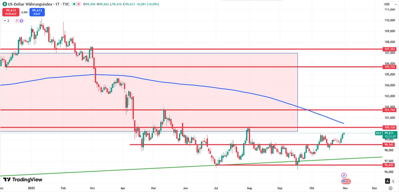 Liefert der ISM mehr Schwung als erwartet, kann er die Märkte wie ein kleiner Rückenwind frisch ausrichten. Besonders spannend bleiben die Unterkomponenten Prices Paid und Employment, denn sie wirken wie Thermometer für Inflation und Arbeitsmarkt, beides zentrale Blickfelder der Fed.Charttechnischer Ausblick: DXY (USD Währungsindex)