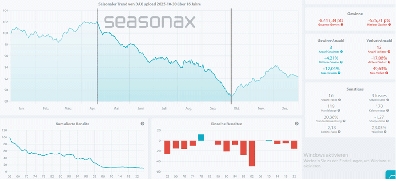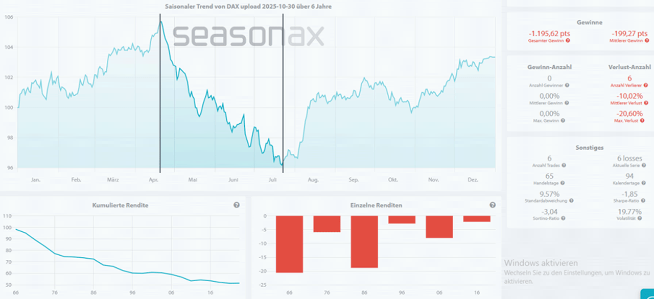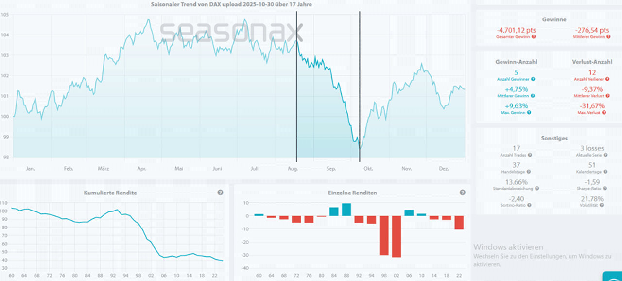 Von August bis Oktober stellt sich dann wieder eine Abwärtsbewegung ein, die allerdings keine allzu ausgeprägte Statistik aufweist. Immerhin steht hier noch eine 3 zu 6 Jahre mit einem Durchschnitt von knapp 8 % in den negativen Jahren zu Buche.