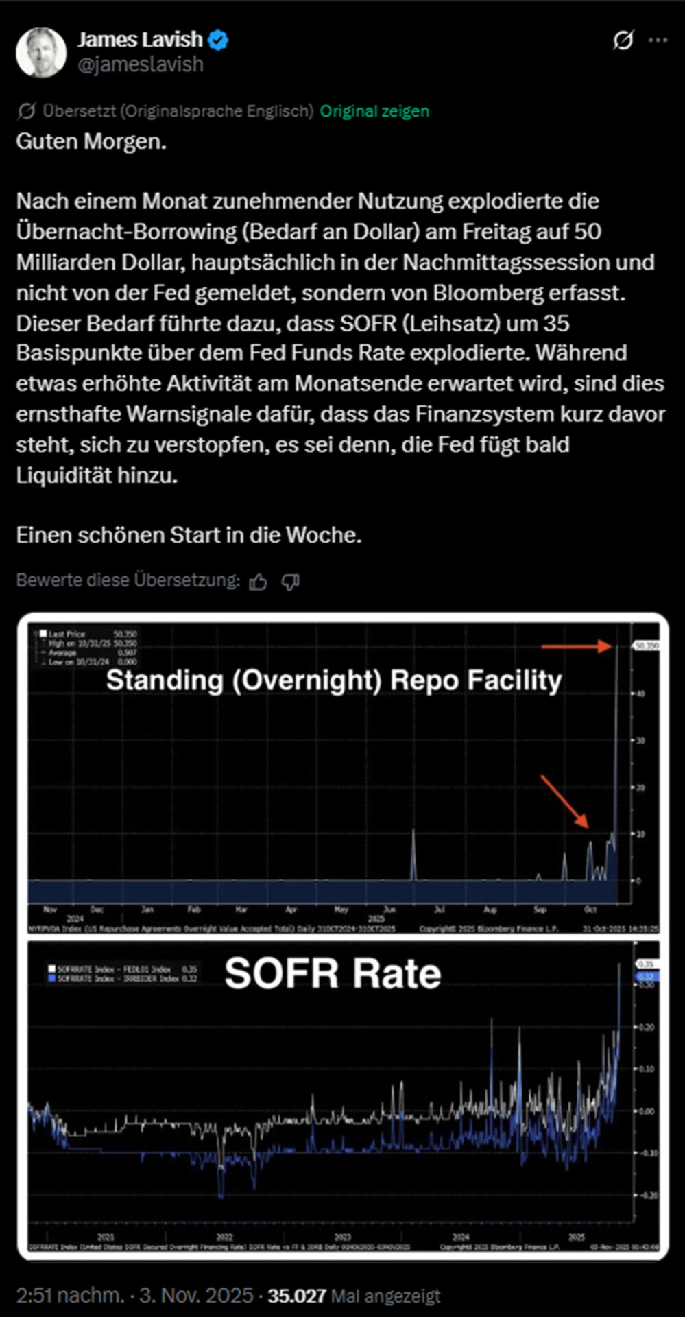 Während die globale Geldmenge weiterhin ruhig atmet und keine dramatischen Warnsignale aussendet, klemmt es an den kurzfristigen Finanzierungsmärkten spürbar. Wie bereits von James Lavish angedeutet, steigt der Bedarf im Overnight-Repo-Markt deutlich. Wer über Nacht Geld beschaffen muss, zahlt plötzlich spürbar mehr. Ein Hinweis darauf, dass kurzfristiges Kapital gerade weniger locker sitzt. Begleitet wird das von einer auffälligen Bewegung beim SOFR-Satz, der in den letzten Tagen nach oben gezogen ist.