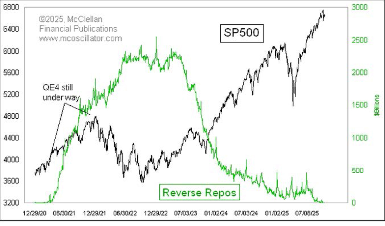 Auch auf der Seite der Fed zeigt sich das Bild: Die Liquidität nimmt weiter ab, und die Reverse-Repos, über lange Zeit eine wichtige Stütze der Hausse, sind mittlerweile fast vollständig abgebaut. Der Motor, der einst für zusätzlichen Schub sorgte, ist trocken gelaufen. Vielleicht einer der Gründe, warum die Fed ihr QT zuletzt beendet hat. Man könnte sagen: Sie hat gemerkt, dass der Tank langsam leer wird.