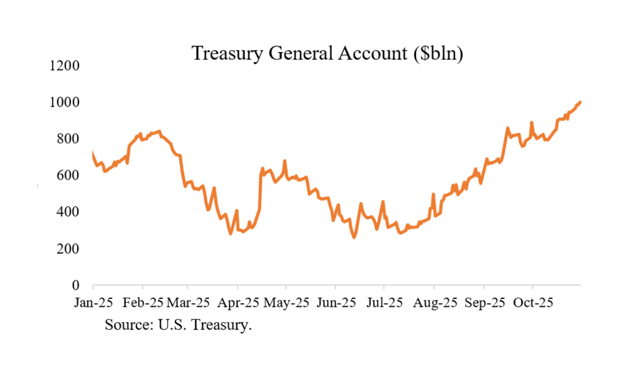Hinzu kommt der Government Shutdown. Er sorgt dafür, dass das Konto des US-Finanzministeriums (Treasury General Account) anwächst und das bindet Liquidität, die dem Markt sonst zufließen würde. Es ist, als würde mehr Geld auf dem Staatssparkonto bleiben, während draußen weniger zirkuliert.