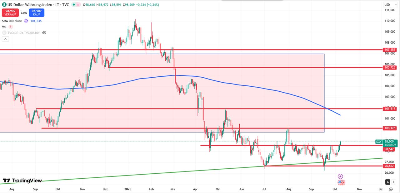 Der Dollar-Index hat nun die markante 98,50 USD gebrochen, was frische Dynamik freisetzen könnte. Damit wurde nach dem höheren Tief auch ein höheres Hoch ausgebildet, was technisch ein Zeichen von Stärke signalisiert. Übergeordnet bleiben wir noch in der großen Range zwischen ungefähr 96,20/70 USD und 100,10 USD.