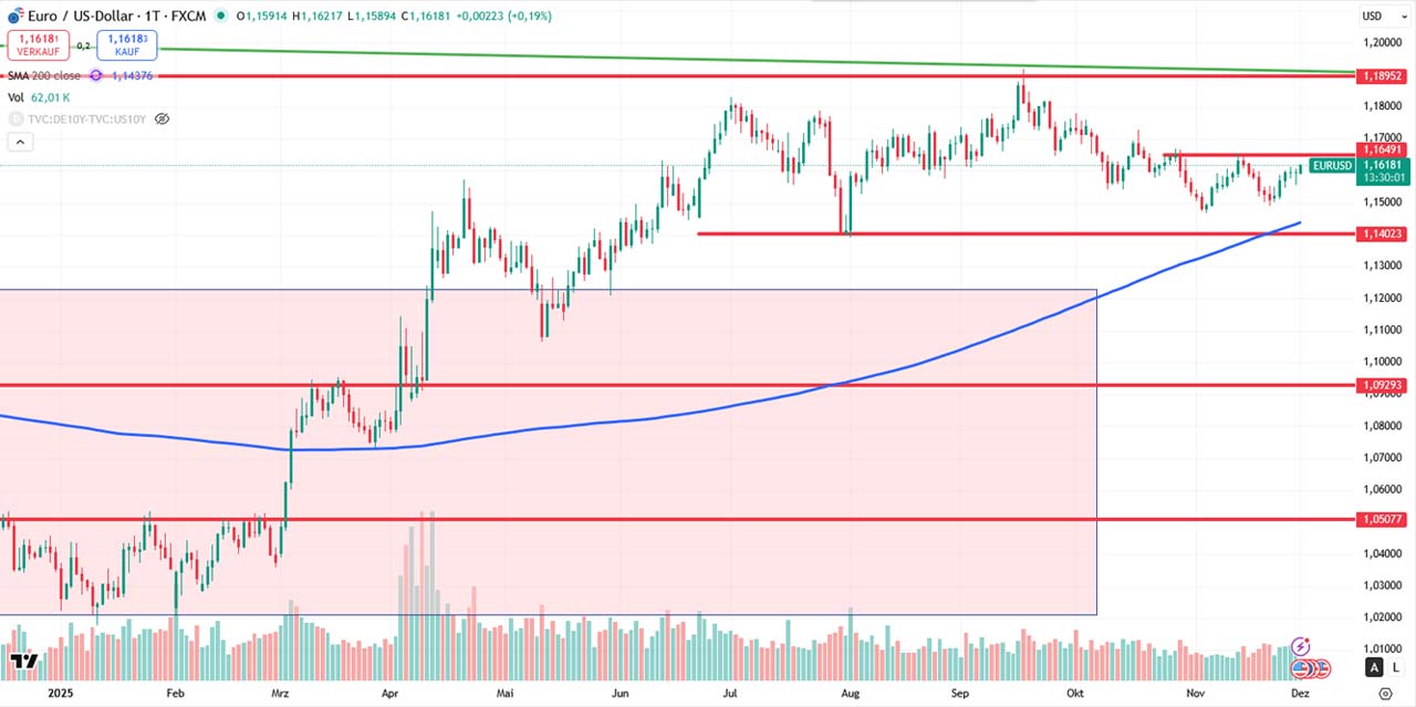 Der EURUSD steckt in einer engen Range zwischen 1,1480/1,15 und 1,1650, eingebettet in einen kurzfristigen Abwärtstrend. Übergeordnet bleibt das Paar weiterhin in einer breiten Seitwärtsbewegung zwischen 1,14 und 1,19. Der Markt wartet hier spürbar auf den nächsten Impuls, der die Richtung klärt.