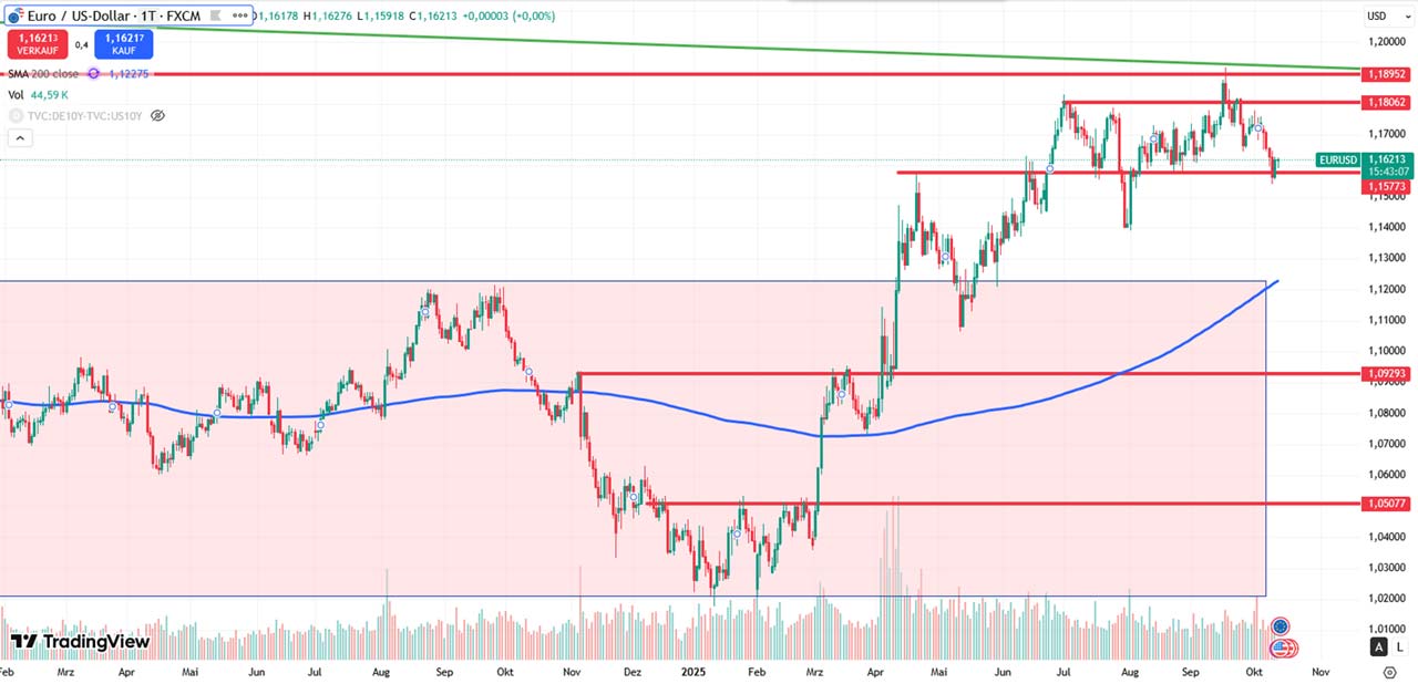 Der EURUSD pendelt seit Wochen in einer engen Spanne und bleibt in einem kurzfristigen Abwärtstrend. Besonders wichtig ist die Zone um 1,1580. Fällt der Kurs nachhaltig darunter, wäre das ein Signal für eine Trendfortsetzung.